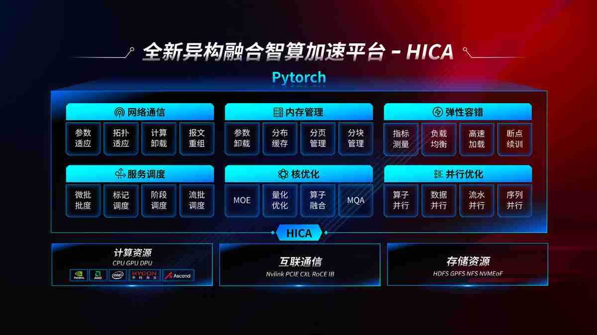 通过自研的服务层、、、、中间适配层、、、以及调度编排算法,,采用数据并行、、模型并行等多种并行方式,,,,把并行计算任务进行有效的分解,,,使其分别由相应的软件栈和算力资源来承接。。。。当GPU资源变化,,,HICA可以实时动态调度计算子任务并调整模型拓扑和架构,,,以充分聚合各种算力资源。。。。