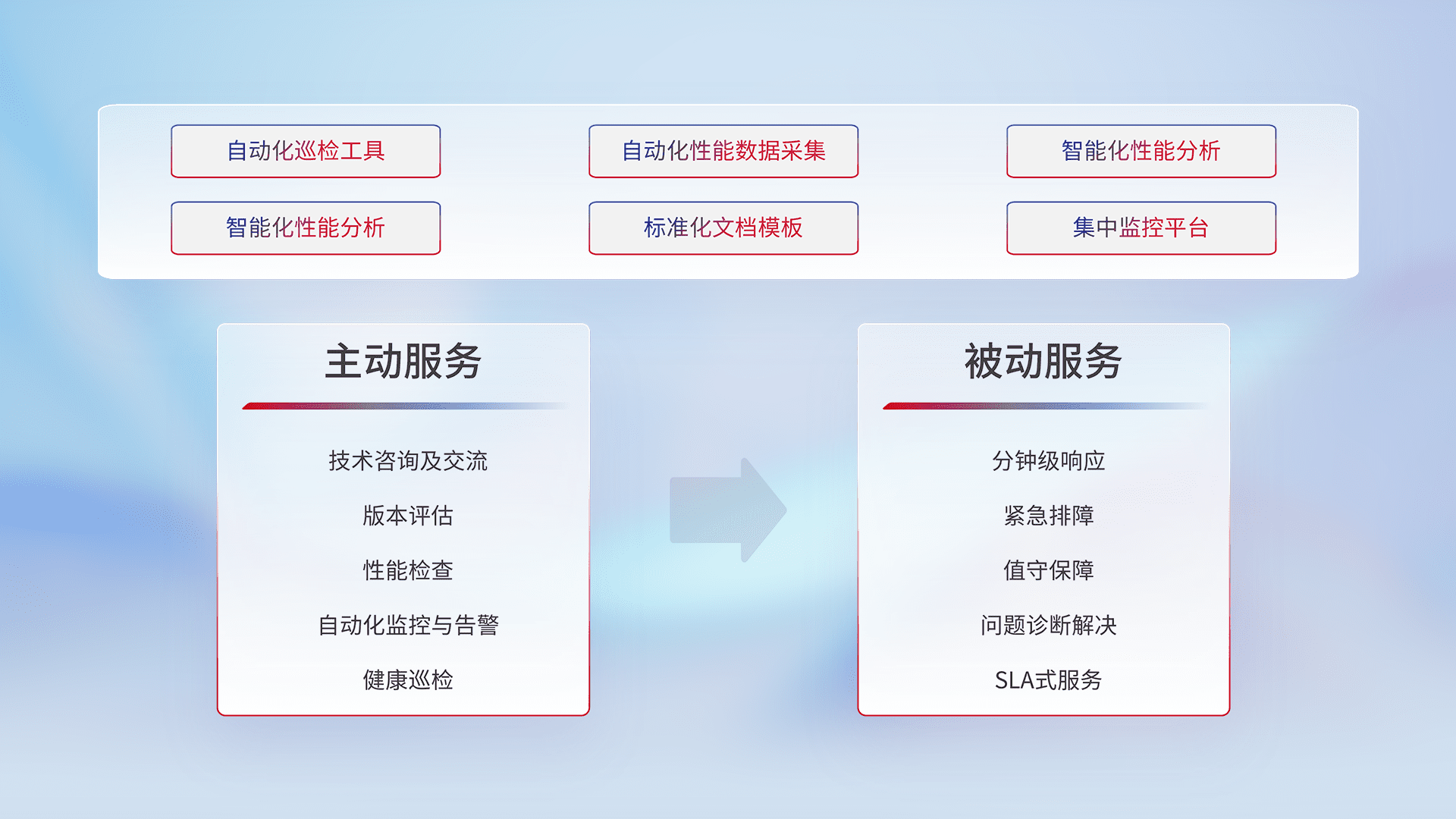 智能化工具和标准化文档,,保障服务质量,,提供主动服务(包含技术咨询、、、版本评估、、、性能检查、、自动化监控与告警、、健康巡检)和被动服务包含(分钟级响应、、、、紧急排障、、、、值守保障、、、问题诊断解决、、、、SLA服务)。。。。