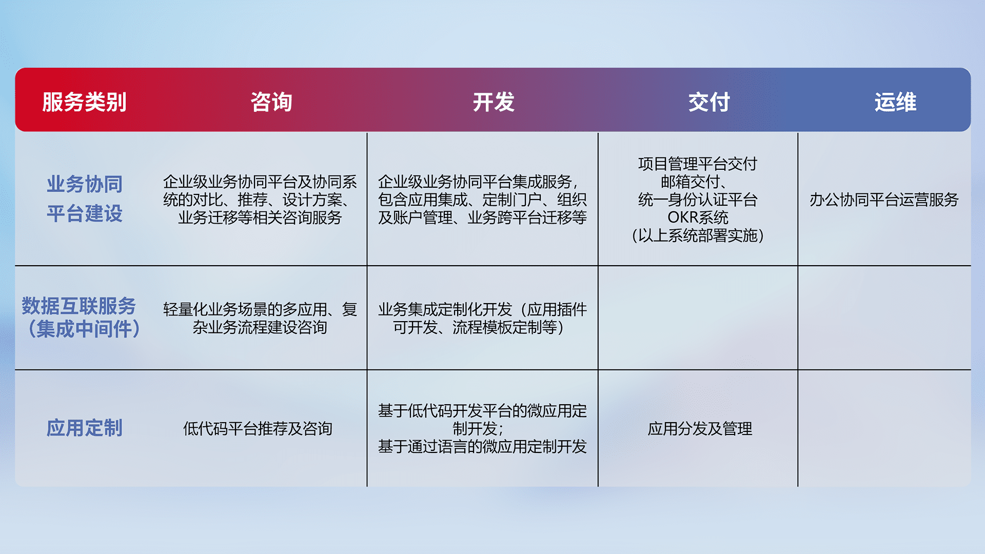 针对钉钉、、、、企微、、、IDaas等平台级产品提供产品的规划、、方案、、、、交付、、、、定制化开发等服务,,,,实现如统一协同办公、、智能客户服务、、、混合会议管理、、、智能数据查询、、、、等业务场景,,,,实现数字化转型。。。